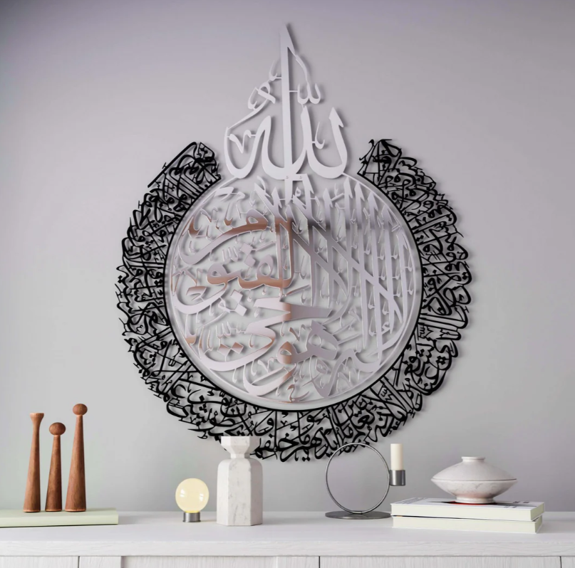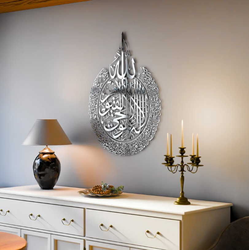 Elevate your home with this Ayatul Kursi Calligraphy Islamic Wall Art, a beautifully designed 2-piece set that brings a sense of tranquility and faith to any space. Crafted with care from polished, reflective metal, each piece showcases Ayatul Kursi in elegant Arabic calligraphy, creating a visually striking and meaningful display.