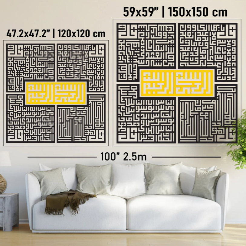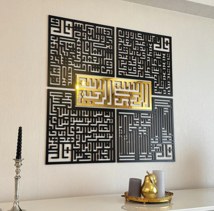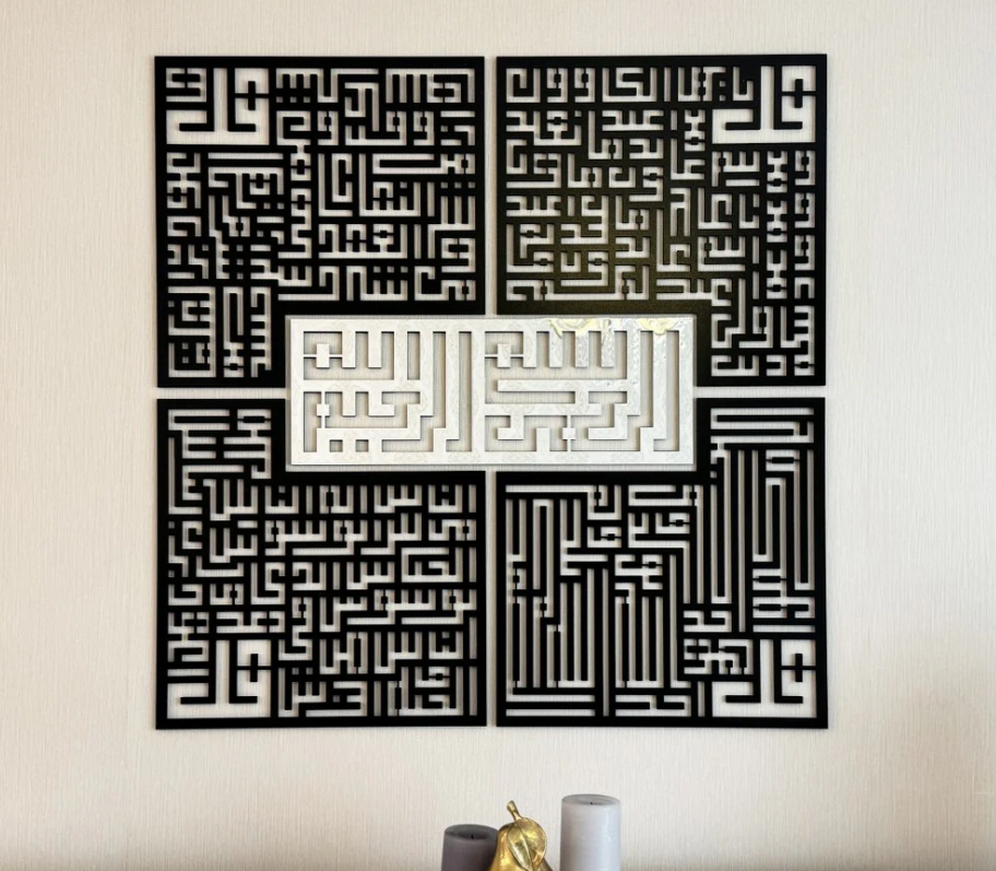 Bring the calming presence of the **4 Qul Surahs—Al-Falaq, An-Nas, Al-Ikhlas, and Al-Kafirun—**into your home with this beautifully designed Kufic Basmala Wooden Islamic Wall Art.